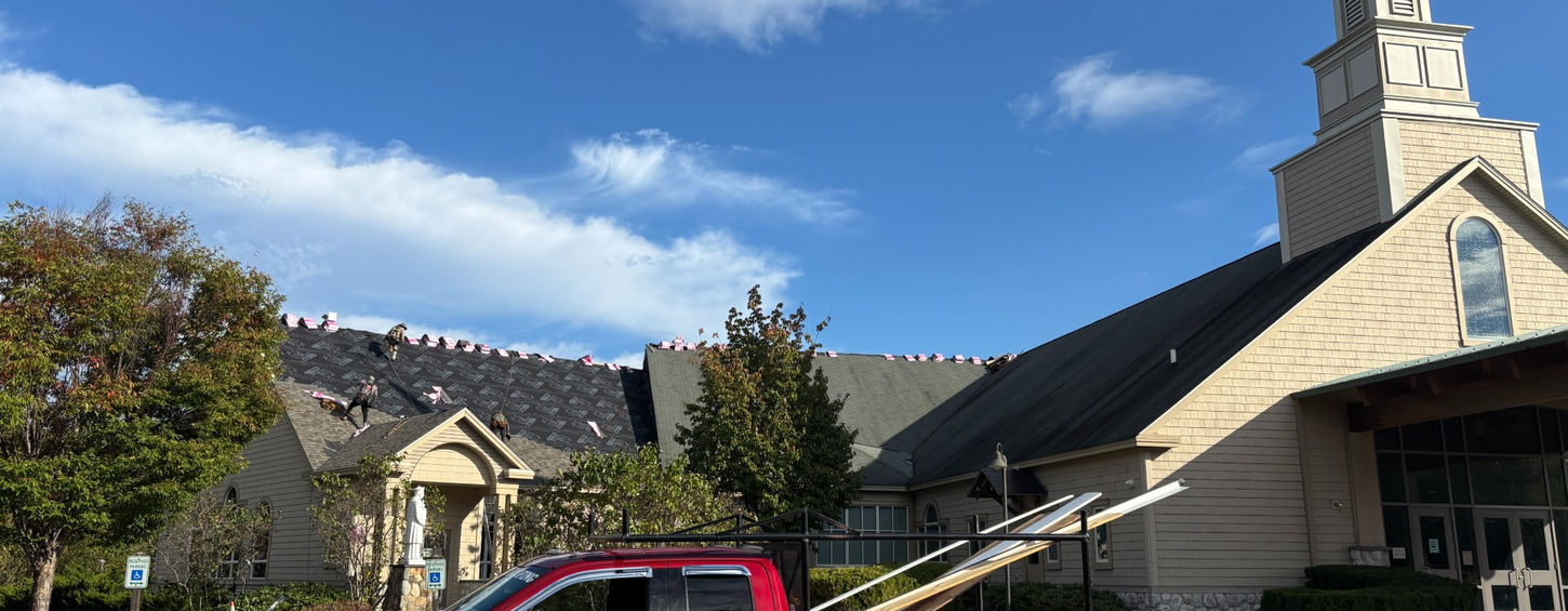 This commercial project in Meredith, NH involved a brown asphalt roof replacement completed for a Catholic church, improving durability and long-term weather protection for the building. The new roofing system was finished with Driftwood-colored shingles from Owens Corning, giving the structure a clean, cohesive look while providing reliable performance for a high-use community property.